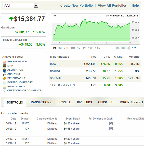 Track total portfolio value and the day's gain/loss, along with a breakdown showing the cost, price, current value and gain/loss of each holding. Transactions page lists the commissions, total shares, average cost and total amount of each holding. Also tracks buys, sells and dividends. Portfolio transactions can be imported from Quicken and Microsoft Money and exported as a CSV or Excel file. Offers several analysis tools including performance chart and map, allocation chart and benchmark comparison. Email alerts can be sent as a daily summary or more frequently with intraday price movements. Current view can be customized and printed. At the bottom of your portfolio, relevant news items and press releases are listed.