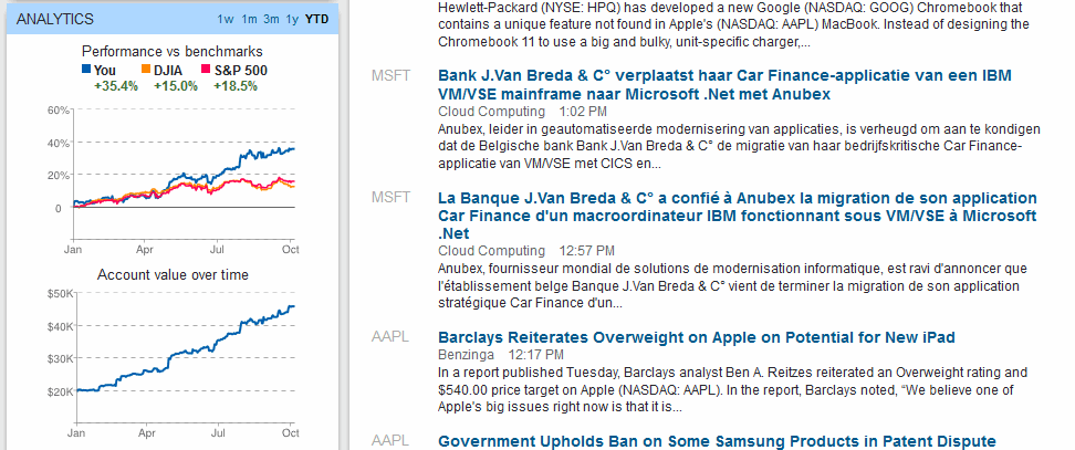 | Portfolio tracking services allow the user to monitor a portfolio. Typically, these websites will send email alerts as portfolio holdings or holdings in a watchlist fluctuate in value or as relevant news becomes available. The top sites track a large number and wide range of securities and holdings, update their data frequently and send timely alerts. Certain sites provide the ability to sync with your brokerage accounts, making it unnecessary to manually update transactions. |