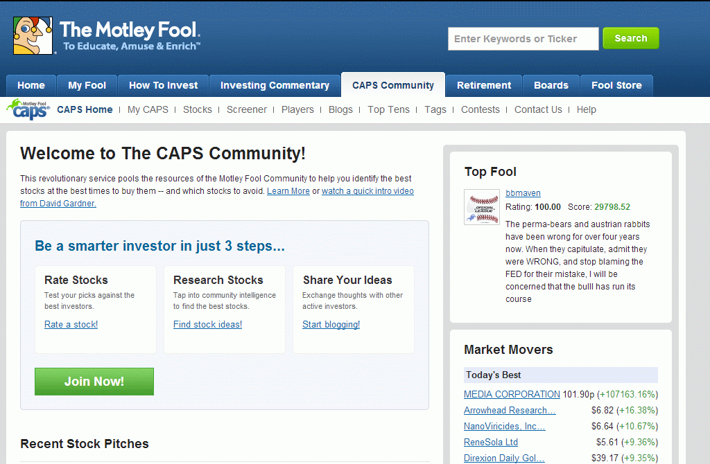 Registered users can post predictions of stock performance relative to the S&P 500 over a specified time period. As stock prices change, the site evaluates player predictions. Over time, players receive an accuracy percentage based on how often they make correct predictions. In addition, based on the performance of their picks, players receive a percentile rating indicating the percentage of players they are outperforming. Stocks also receive ratings, which are aggregations of every player prediction for that stock, indicating whether or not players think the stock will outperform the S&P 500. Players with higher ratings have more influence on stock ratings. CAPS screener allows users to screen for stocks with varying CAPS ratings as well as on financial data elements. Though there are competitive websites, CAPS remains the most popular of its kind.
