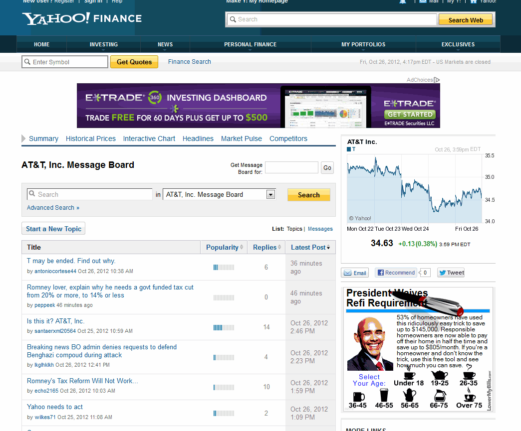 Investment message boards on stocks traded in the U.S., including over-the-counter stocks, are broken down into investment type or sector. Users can rate individual posts and sort posts by rating. Be aware that boards are not monitored closely so spam is a bit of a problem, though offensive posts can be reported and specified posters can be ignored. This forum should be used primarily for discussing stocks with other investors, not for actual analysis.