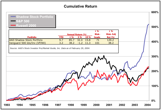 The results for the Individual Investors Shadow Stock Portfolio have been updated since our last quarterly report and are shown in Figure 1. Table 1 shows the current positions and the status of the different holdings as of February 27, 2004.