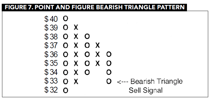 Another typical point and figure pattern is triangles, both bearish and bullish. The hallmark of any triangle pattern is that, as prices fluctuate, higher lows and lower highs are created. Figure 6 illustrates a bullish triangle pattern. As you can see, as you move to the right, the highs become lower and the lows higher as the height of each column gets smaller and smaller. At this point, you have no idea which way the price may go if it were to break out of the formation, meaning you must wait for the pattern to be confirmed before entering your trade. As it plays out in Figure 6, the bullish triangle forms a double top at $36 and generates a buy signal when the price crosses above $36 and breaks out of the triangle pattern. If the price were to reverse itself, however, you should still pay close attention, because there is the possibility of a double bottom forming—a potential sell signal.