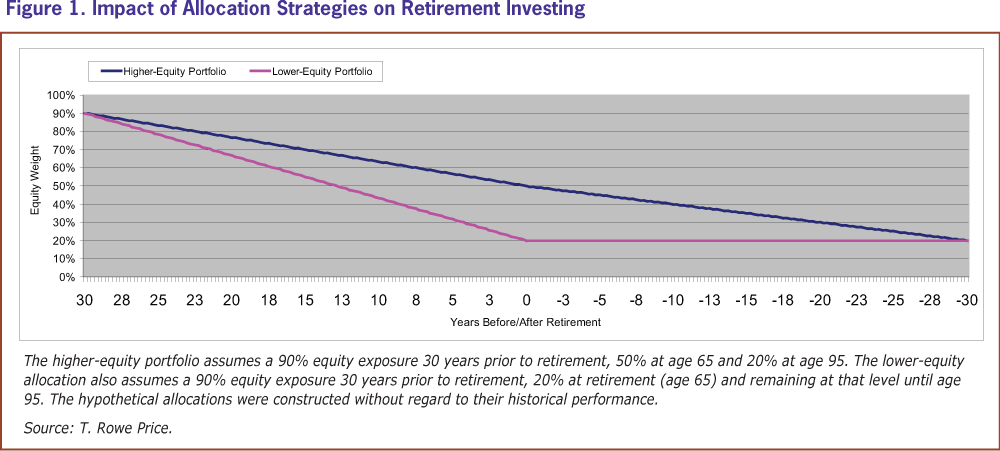 Looking at only the withdrawals from equal levels of retirement savings, however, ignores when the two investors started investing. Retirement savers do not just happen to arrive at their retirement dates with nest eggs that are independent of asset-allocation decisions made over years of saving.