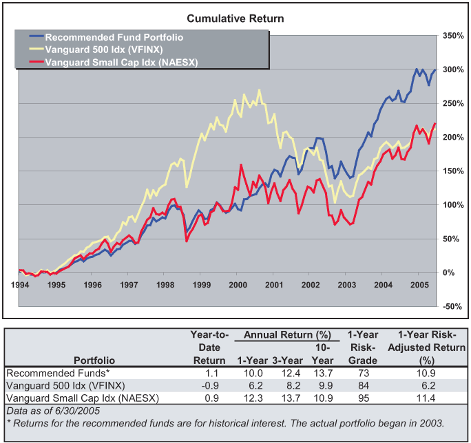 Since the fund portfolio is now two years old, itÂ’s helpful to separate the performance history of the funds currently recommended from the performance of the actual portfolio (it is a real portfolio). The history of the currently recommended funds, as shown in Figure 1, is important because it lets you see the characteristics of the funds we currently recommend and their performance over various periods.