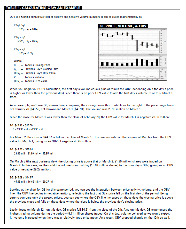 Table 1 shows you how to calculate the OBV using daily data for General Electric for the period February 28–March 16, 2001. However, most technical analysis programs include OBV in their selection of technical indicators.