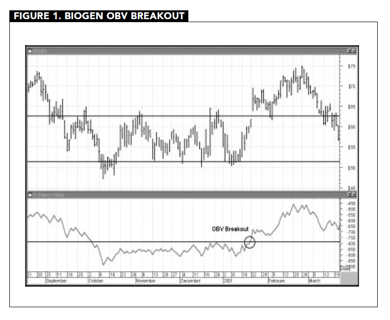 Figure 1 illustrates an OBV breakout for Biogen (BGEN). As you can see from the price chart, Biogen entered a period of decline beginning in mid August of 2000, during which time money flowed out of the stock as OBV fell. In early October, Biogen found a bottom and pulled back into a trading range between $52 and $63. Over the next three months, both the price and OBV fluctuated within a defined range. Then in mid-January 2001, the OBV value rose above its previous high value, a signal that a breakout is taking place, followed a couple of days later by the price moving outside of the trading range. In this example, an investor would want to go long when OBV began reaching new highs and stay in the trade until the upward trend in OBV reversed itself. With Biogen, the breakout to the upside lasted roughly a month, at which point both OBV and price reversed course.