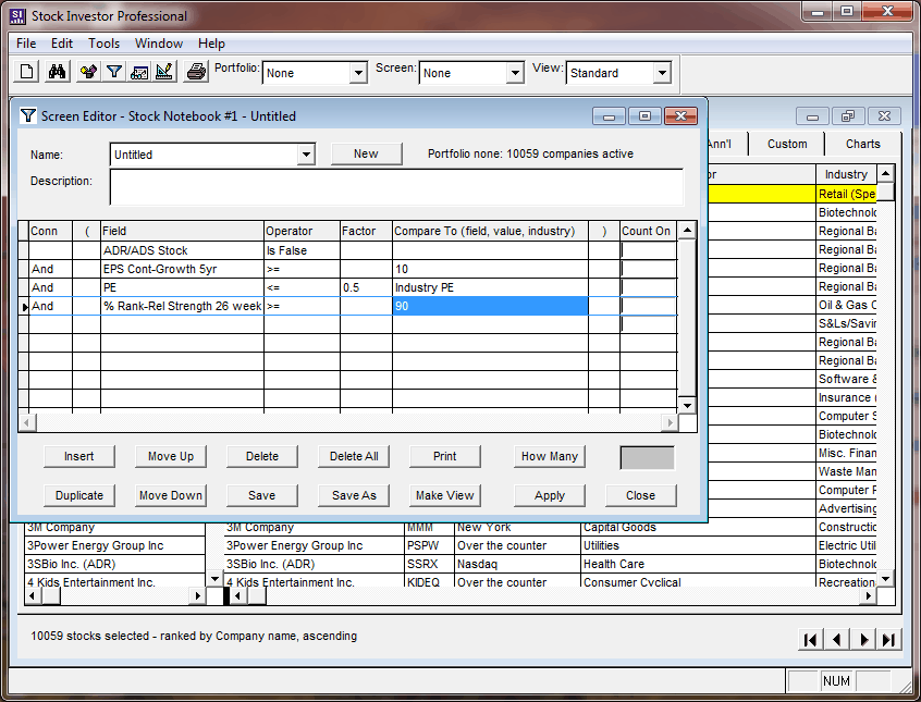 The Description window displays a brief description of a saved screen if one was entered at the time it was saved. Below the description area you will find the actual “editor,” which looks like the cells of a spreadsheet and consists of eight columns. It is here that you enter the comparison statements that make up a screen criterion. Below this area are 12 buttons: Insert, Duplicate, Move Up, Move Down, Delete, Save, Delete All, Save As, Print, Close, How Many and Apply.