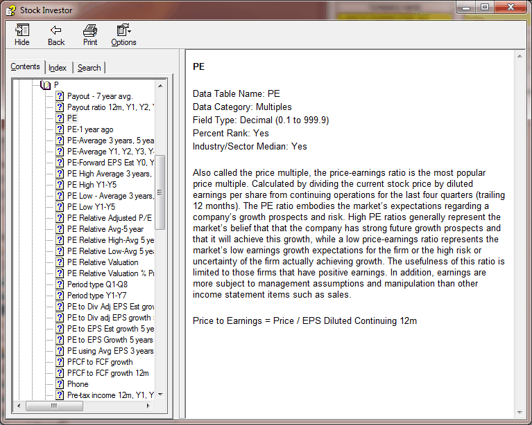 As an example, to locate the data category for PE, double-click on Alphabetical Listing of Field Definitions and again on the “P” (for PE). This will show in alphabetical order all of the data field names in the program that start with the letter “P.” Double-click on PE from the list to bring up its field definition window. The field definition window tells us that the PE field is in the Multiples data category. Furthermore, we see that the value is displayed in decimal format and that percent rank and industry/sector medians are calculated for the field. You are also given a definition of the ratio.