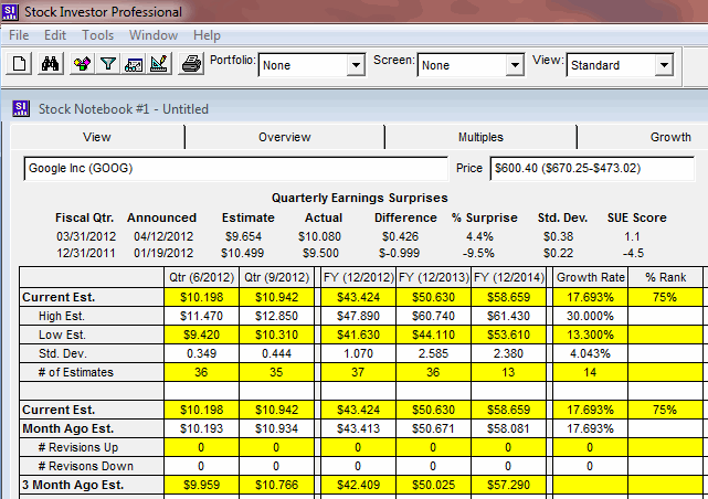One lesson many investors quickly learn is that the market is forward-looking. Security prices are dictated by expectations, and prices fluctuate as these expectations are affirmed or are proven to be unfounded. Some of the most frequently followed measures of market expectations are consensus earnings estimates. Stock Investor Pro provides a variety of earnings estimate data from I/B/E/S, which is part of Thomson Reuters. Users will find this data on the Estimates tab of the Stock Notebook within Stock Investor Pro. In this installment of Stock Investor News, we provide a discussion of this data, as well as how it may be used in the screening process.