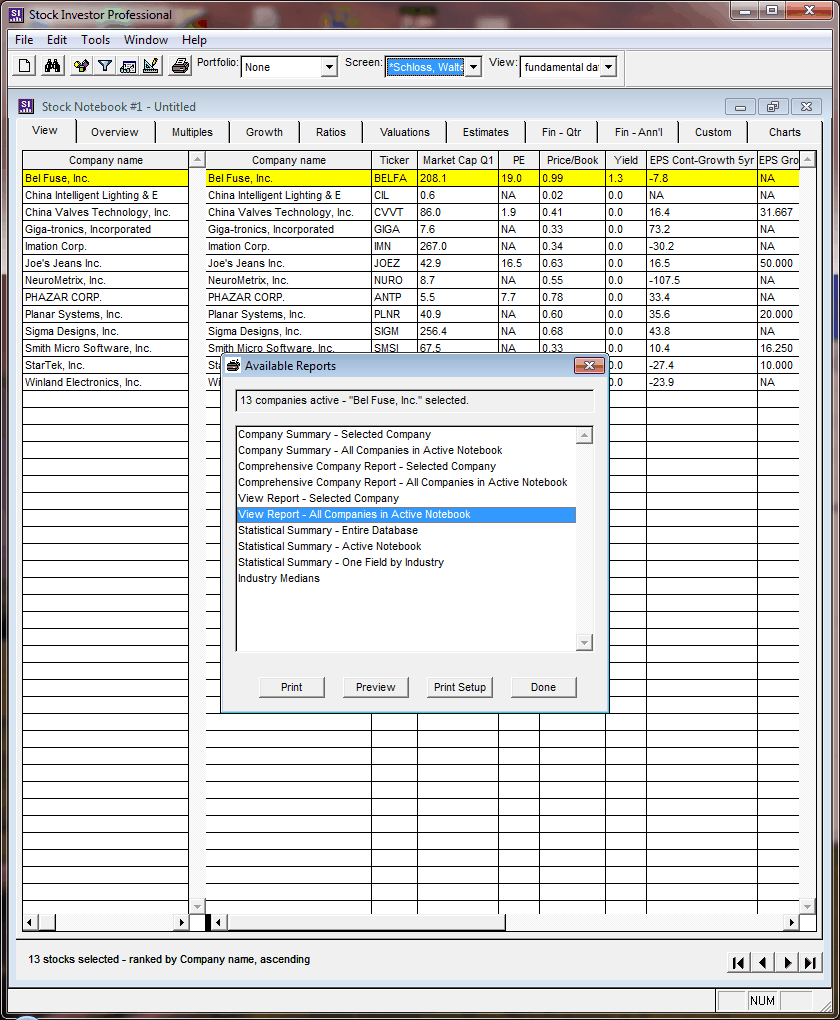 Therefore, you can calculate various statistical data on the results of a screen, a portfolio of companies, or the entire universe of companies in Stock Investor Pro. To print a statistical summary report using the Fundamental Data view for the Schloss passing companies, we must again apply the *Schloss, Walter screen from within the Screen Editor or select it from the screen pulldown menu at the top of the program window. You then go to the Available Reports menu by clicking the print icon on the toolbar or select Print from the File menu (File – Print). Next, select Statistical Summary – Active Notebook, click the Print or Preview button, select the view you wish to print (Fundamental Data) and then click the Ok button to generate the Statistical Summary Report.