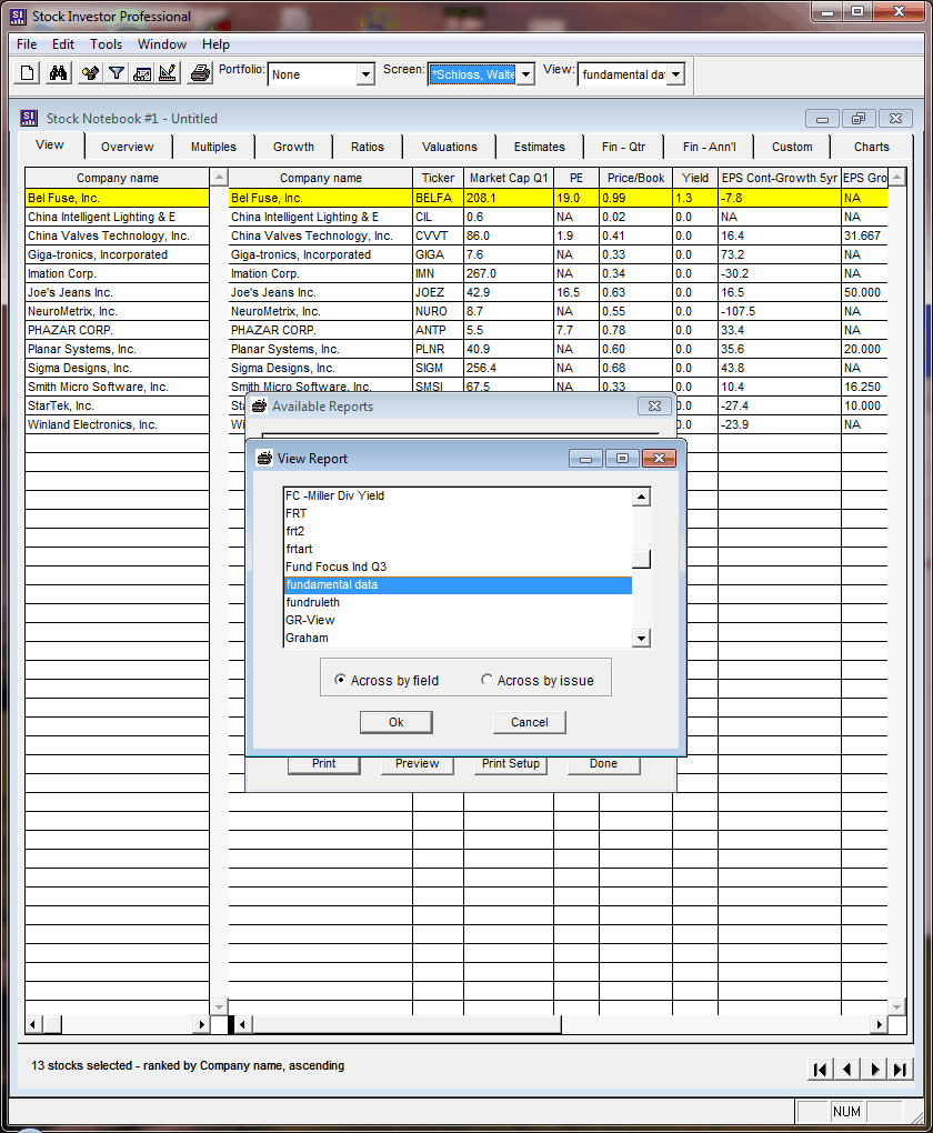 Using the *Schloss, Walter screen that comes preloaded in Stock Investor Pro as an example, we load the Fundamental Data view created in our previous Stock Investor News installments. To print a view report using the Fundamental Data view for these companies, go to the Available Reports menu, select View Report – All Companies in Active Notebook, and then click the Print button at the bottom of the Available Reports window. At the View Report options window, you can select the view you wish to print (Fundamental Data) and whether you wish to display across by field or issue (company). Once you are finished, click the Ok button to generate the view report.