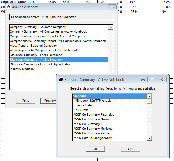 Statistical summary reports are similar to view reports in that both are based upon a view containing the data fields you specify. However, while view reports display the selected field values for each company, statistical summary reports calculate the average, median, high, low and standard deviation values for the generated fields based on the active set of companies in the stock notebook. The active set of companies may be the entire database of companies, the companies in a loaded portfolio, or the results of an applied stock screen.
