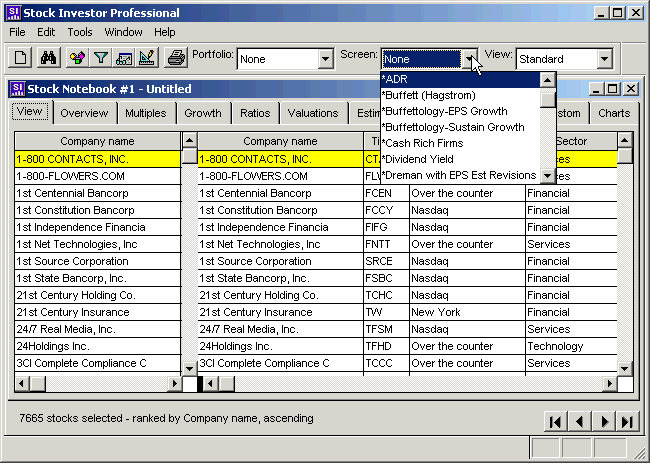 If you know which screen you want to run, you can select it from the Screen pull-down menu found at the top of the program window (Figure 1). In Stock Investor, those screens preceded by an asterisk (*) are the screens that come pre-installed with the software. (Note: If there are no screens with asterisks, you did not load the AAII predefined data when you installed the program. Exit the program, open Stock Investor Utilities and choose the “Load predefined data” option.) Choosing a screen from the pull-down menu will automatically run the screen against the active set of companies and load the passing companies (results of the screen) in the Stock Notebook.