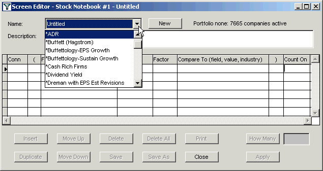 Within the Screen Editor, there are two ways to “run” a screen. At the bottom right-hand side of the Screen Editor window are the How Many and Apply buttons. If you would like to know how many companies pass a screen, but do not wish the results to be loaded into the Stock Notebook, click on the How Many button. Doing so with the O’Neil screen tells us that five companies pass the screen. At this point, the full database of 7,665 companies (as of July 23, 2004) still comprises the active Stock Notebook. If you closed the Screen Editor, the companies you would see in the Stock Notebook would not be the results of the screen on which you ran the How Many function.