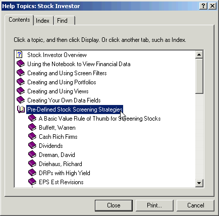 It is always important to understand a particular investment approach before you devote your money to it. Within Stock Investor’s Help System, you will find articles discussing each of the program’s predefined stock screens (Figure 6). To access the articles, select Contents from the Help menu at the top of the program window. From the Contents tab of the Help Topics window, double-click on Pre-Defined Stock Screening Strategies. This will expand the topic category to show all of the stock screens in Stock Investor. Click on any of the article titles to display the full text of the article (Figure 7).
