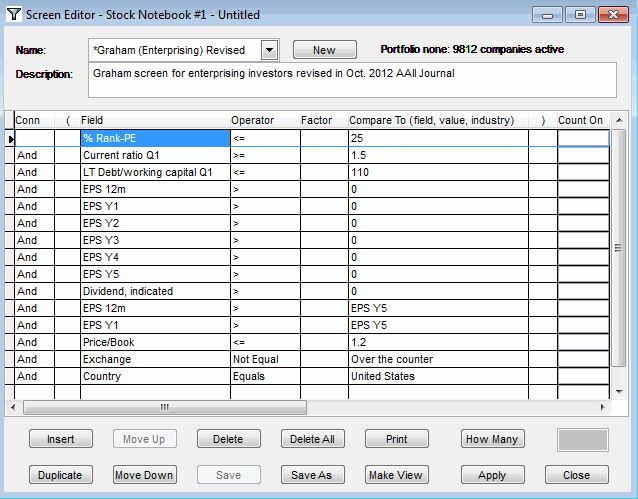 The Graham Enterprising Revised screen can now be found in Stock Investor Pro as one of the predefined screens. The criteria for the Graham Enterprising Revised screen are detailed below, giving the rationale behind each filter in the screen. If a change was made to the original Graham Enterprising Investor screen, it is also noted below.