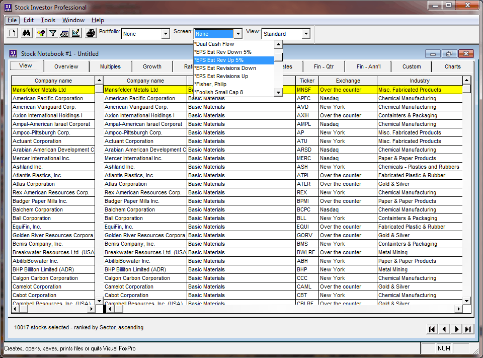 Within the Screen Editor, there are two ways to “run” a screen: by using the How Many button and by using the Apply button, both located at the bottom right-hand side of the Screen Editor window. If you would like to know how many companies pass a screen, but do not want the results to be loaded into the Stock Notebook, click on the How Many button. At this point, the full database of 10,017 companies (as of November 11, 2011) still comprises the active Stock Notebook. If you closed the Screen Editor, the Stock Notebook would show that full listing, not the results of the screen on which you ran the How Many function.