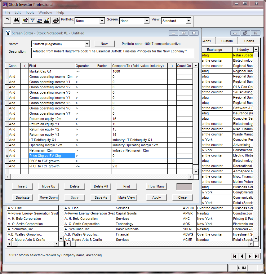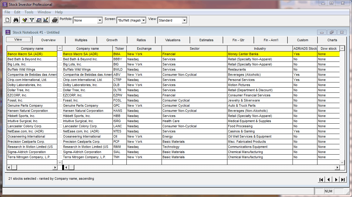 In order to run a screen and have the results (the passing companies) loaded into the Stock Notebook for viewing and additional analysis, you must click the Apply button. Applying Hagstrom’s Buffett approach to the universe of active stocks as of November 11, 2011, loads 21 *Buffett (Hagstrom) passing companies into the Stock Notebook.