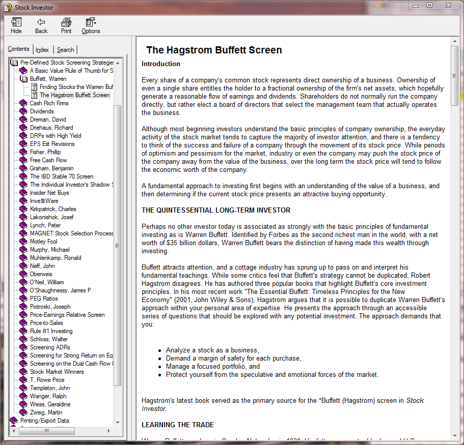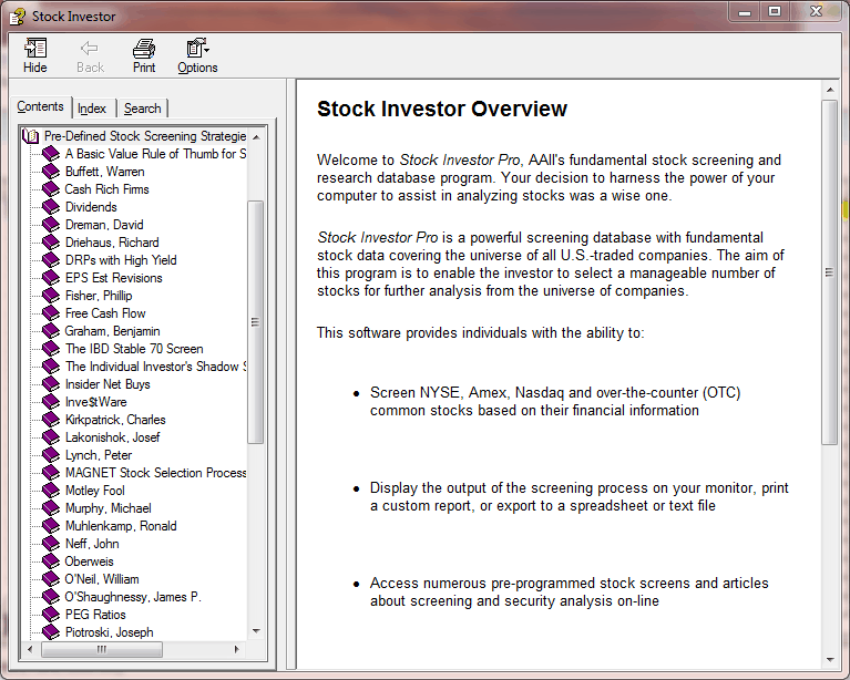 It is always important to understand a particular investment approach before you devote your money to it, and the predefined stock screens represent an excellent educational resource. Within Stock Investor Pro’s Help System, we have compiled a list of screening articles. To access these articles, select Contents and Index from the Help menu at the top of the program window. From the Contents tab, double-click on Pre-Defined Stock Screening Strategies. This will expand the topic category to show the names of all of the preprogrammed stock screens. Clicking on a name will open the overview article for an approach.