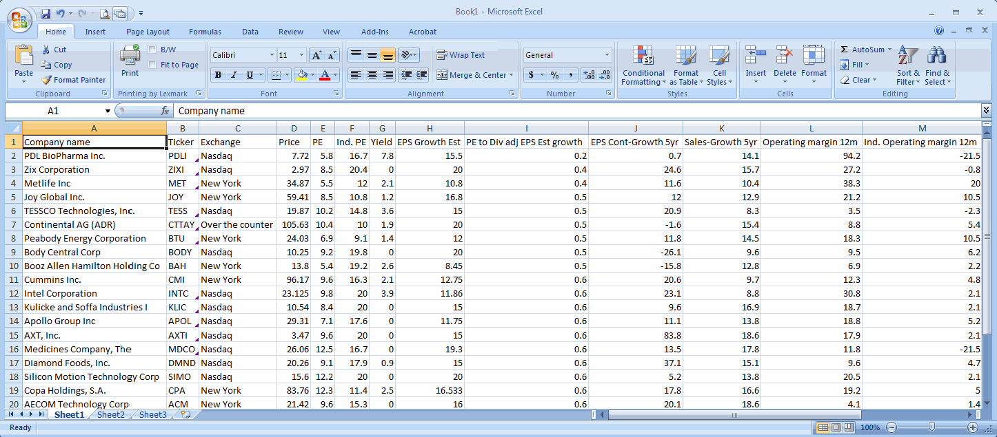 The contents of a Stock Notebook can be the entire database of stocks, the results of a screen or the companies in a specific portfolio. The Stock Notebook also contains the data fields specified in the loaded view. The sample Stock Notebook is loaded with the results of the Neff, John screen using data as of October 19, 2012, with the Multiples view selected. In addition, the list of companies is ranked by price-earnings ratio, from lowest to highest.