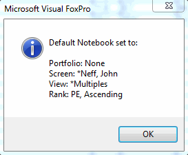 Begin by choosing a portfolio, a screen, a view and a rank order. The easiest way to choose a portfolio, screen and view is to simply select each from the pull-down menus at the top of the page. You can choose a ranking order by selecting Rank from the Tools menu or by simply right-clicking on a column heading. Referring back to the sample Stock Notebook, the Neff, John screen is loaded with the Multiples view, but no portfolio is chosen. The list is ranked in ascending order by price-earnings ratio. Once the format of the desired default Notebook is specified, click on the camera icon in the toolbar to set the current Stock Notebook template as the default. Alternatively, you can select Set Current Notebook to Default from the File menu. A pop-up window will provide confirmation of default Notebook change.