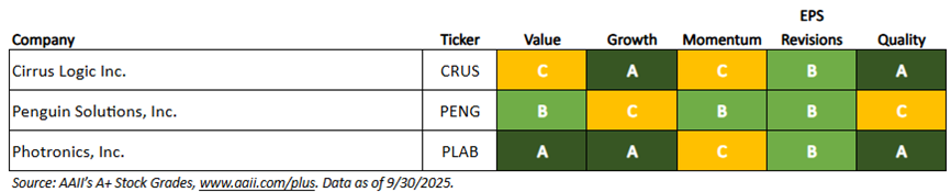 Using AAII’s A+ Stock Grades, the following table summarizes the attractiveness of three semiconductor stocks—Cirrus Logic, Penguin Solutions and Photronics —based on their fundamentals.
