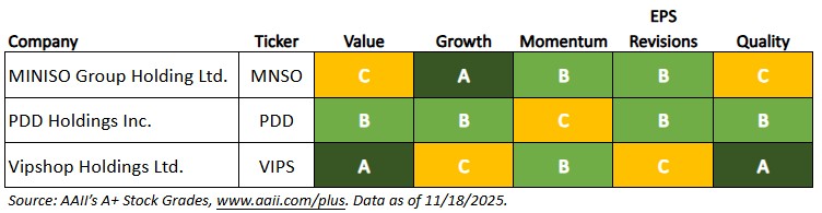Using AAII’s A+ Stock Grades, the following table summarizes the attractiveness of three retail stocks—MINISO, PDD Holdings and Vipshop—based on their fundamentals.