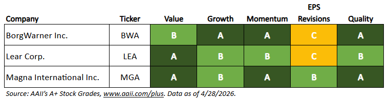 Using AAII’s A+ Stock Grades, the following table summarizes the attractiveness of three automobile component stocks—BorgWarner, Lear Corp. and Magna International—based on their fundamentals.